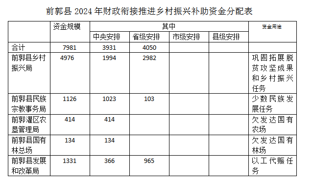 現(xiàn)將前郭縣2024年財政銜接推進(jìn)鄉(xiāng)村振興補(bǔ)助資金分配情況予以公示,公示期為10天(2024年5月10日至5月22日)。如對結(jié)果有異議,請在公示期內(nèi)對以下部門提出意見。